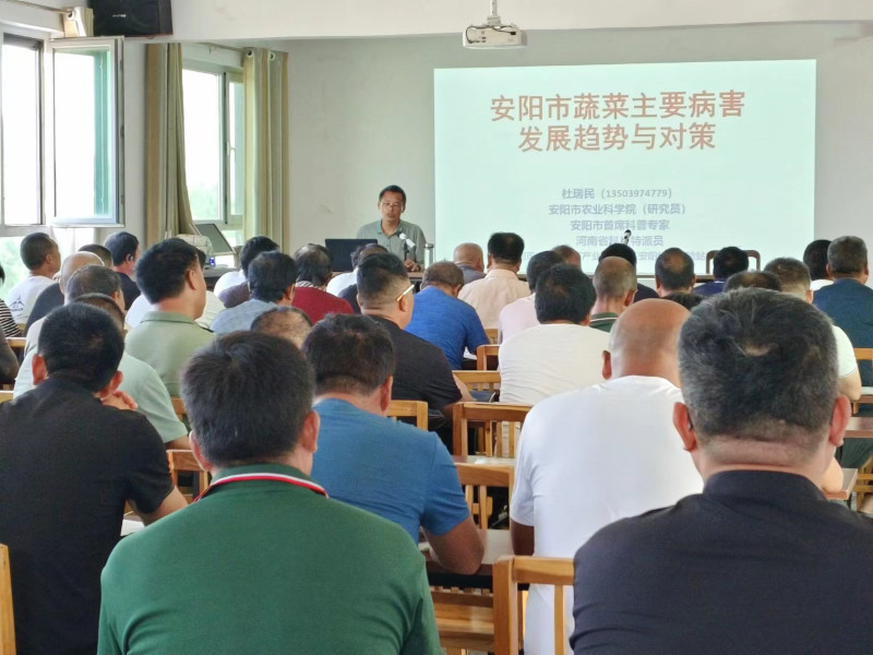 此次培训吸引了内黄县蔬菜办下属60多名村级农民技术员参加,杜瑞民研究员以“安阳市蔬菜主要病害发展趋势与对策”为题,结合近年来安阳市辣椒、番茄、茄子、黄瓜、西瓜、甜瓜、豇豆等十多种蔬菜病害发生情况,详细讲解了各种病害的发生发展规律和识别方法,重点从选用优良品种、种子消毒、培育壮苗、轮作倒茬、夏季高温焖棚消毒土壤、采用滴灌、科学用药等方面介绍了病虫害综合防治新技术新方法。杜瑞民研究员还在现场讲解了当前秋季蔬菜管理技术,对种植户现场提出的问题一一解答,得到了与会人员高度好评。